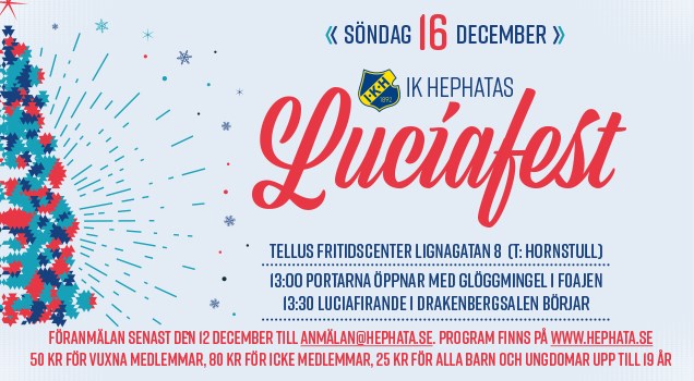 Den 16 december är det äntligen dags för klubbens årliga luciafirande, den 81:e i ordningen. Vi har nu valt att utveckla klubbens luciafirande till något större som ska bli en återkommande tradition i samband med klubbens luciafirande. Efter huvudnumret, Luciatåget, så kommer vi också att uppvakta klubbens duktiga aktiva och ledare på olika sätt. Vi öppnar portarna till Foajén i Tellus Fritidscenter som ligger på adressen Lignagatan 8 i Hornstull klockan 13:00 med glöggservering. Klockan 13:30 går vi in och sätter ner oss i Drakenbergssalen och börjar firandet med olika programpunkter. Vi kommer också på plats att dra medlemslotteriets bonusdragning som är en extradragning utöver den ordinarie åtta dragningar som ingår i medlemslotteriet. Bonusdragningen omfattar endast dessa medlemmar som är på plats. Utöver medlemslotteriet så kommer vi också att ha något som heter Jullotteriet med olika spännande vinster där en lott ingår i entrén men man kan också köpa fler lotter som kostar 10 kr per lott, vinster i lotteriet kommer att presenteras på plats. Under firandet kommer vi också att uppvakta våra duktiga medlemmar, båda aktiva och ledare på olika sätt: - Utdelning av utmärkelser - Uppvaktning av medlemmar som vunnit olika tävlingar - Utdelning av hedersutmärkelse - Utdelning av ett nytt stipendium Vi vill också påminna er om en tradition som vi har i samband med luciafirandet, att alla tidigare hephatalucior brukar ta med medaljongen när de kommer till luciafirandet. Alla barn får också en liten påse med lite gott i slutet av firandet, viktigt att ni skriver i er anmälan om ert barn ska få en påse. Entrén kostar 50 kr för vuxna medlemmar från och med 19 år och så 80 kr för icke medlemmar. För barnen, båda medlemmar och icke medlemmar så kostar det 25 kr. Ni anmäler er till luciafirandet genom att maila till anmalan@hephata.se, ni anger då samtidigt namn på alla som kommer i ert sällskap. Vi behöver ha er anmälan senast den 12 december. Det finns också en möjlighet för er att betala entrén i förväg så ni kommer in snabbare. Ni betalar genom att swisha summan för ert sällskap till klubbens swish nummer 123 249 47 63. Glöm inte att ange namn på alla i ert sällskap i meddelandet. Betalningen skall då ske senast den 12 december. IK Hephatas luciafest Tid: 16 december klockan 13:00 Plats: Tellus Fritidscenter, Lignagatan 8 i Hornstull Entré: Entrén kostar 50 kr för vuxna medlemmar från och med 19 år och så 80 kr för icke medlemmar. För barnen, båda medlemmar och icke medlemmar så kostar det 25 kr.