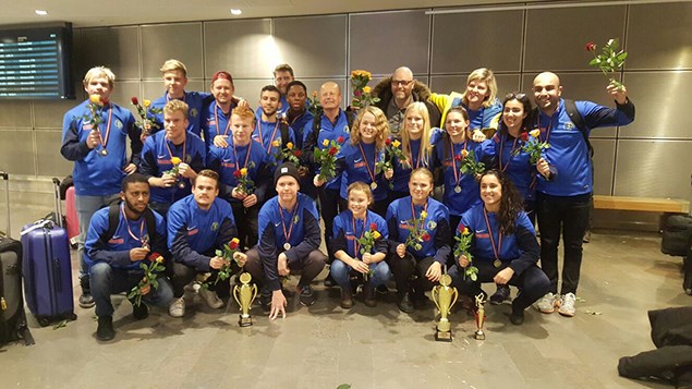 I lördags uppvaktade klubbens vice ordförande Romel Belcher och styrelseledamoten Amina Ouahid våra guld- och bronsmedaljörer när de kom hem till flygplatsen Arlanda från Riga. Det var glada miner då våra svenska landslagen haft framgångar under den Nordisk Baltiska Mästerskapet i Futsal som spelades i Riga, Lettland den 14 - 19 november 2016. Där var det hela s j u t t o n representanter från Idrottsklubben Hephata med på båda spelar- och ledarsidan! Framgångsrikaste var damlandslaget som vann deras andra raka NBM guld efter att gått genom hela mästerskapet obesegrade. Man avslutade med en förkrossande storseger mot våra norska grannar med imponerande 13-0 där man dominerade matchen från start. Här har vi nu sett starten på något stort om tjejerna fortsätter med det de påbörjat, var så säker! Dessutom blev Fatima Tebibel mästerskapets MVP! Fatima fortsatte sen med att vinna skytteligan tillsammans med Matilda Jansson där de gjorde fem mål var och ett. I laget kommer sju spelare och två ledare från Idrottsklubben Hephata: Jamila Ouahid, Målvakt Fatima Tebibel Cecilia Björck Wilma Björck Matilda Jansson Pauline Englund Sofia Lindevall Ausa Wahlström, Huvudansvarig Belan Zengana, Förbundskapten Herrarna knep bronset efter att börjat turneringen i moll efter förluster mot Norge och Danmark, men kunde avsluta turneringen i dur när man knep bronset. Det efter avslutande segrar mot Finland och Lettland. Herrlaget var ett ganska ungt lag med flera debutanter som växte under turneringen. Man har visat att man idag har en bredd att jobba med på herrsidan, det ska bli spännande att se om man kan förvalta det här! I laget kommer sju spelare och en ledare från Idrottsklubben Hephata: Erik Akervall, Målvakt Pa Ceesay Tim Widmark Samson Teclemariam Jabbar Faraj Grimh Abrahamsson Anton Lindberg Nyberg Daniel Littorin, Huvudansvarig Ni kan läsa mer utförligare om hur det gått under mästerskapet på Svenska Dövidrottsförbundets webbsida www.dovidrott.se BILD: Översta raden fr. vä: Grimh Abrahamsson, Tim Widmark, Erik Akervall, Jabbar Faraj, Joakim Blomqvist (tolk), Pa Ceesay, Janne Lundberg (tolk), Jerker Björck (representant från förbundet), Ausa Wahlström och Belan Zengana. Andra raden fr. vä: Jacob Genberg, Anton Lindberg Nyberg, Cecilia Björck, Pauline Englund, Sofia Lindevall och Jamila Ouahid. Tredje raden fr. vä: Samson Teclemariam, Daniel Littorin, Patrik Andersson, Wilma Björck, Matilda Jansson och Fatima Tebibel. Notering: Det var en annan mindre grupp som reste hem direkt till Landvetter i Göteborg så det inte är alla som kom med på vår gruppbild.